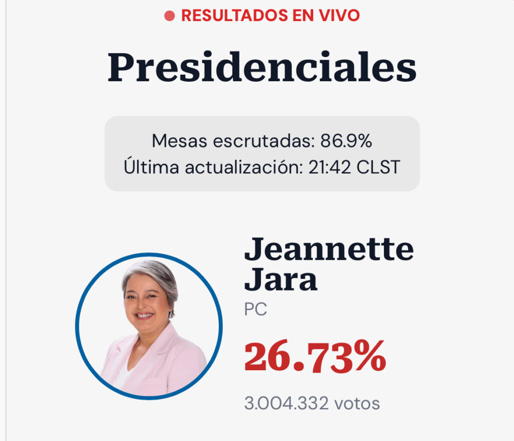 Jeannette Jara (coalición de izquierda) encabeza con aproximadamente el 26,7 % de los votos.