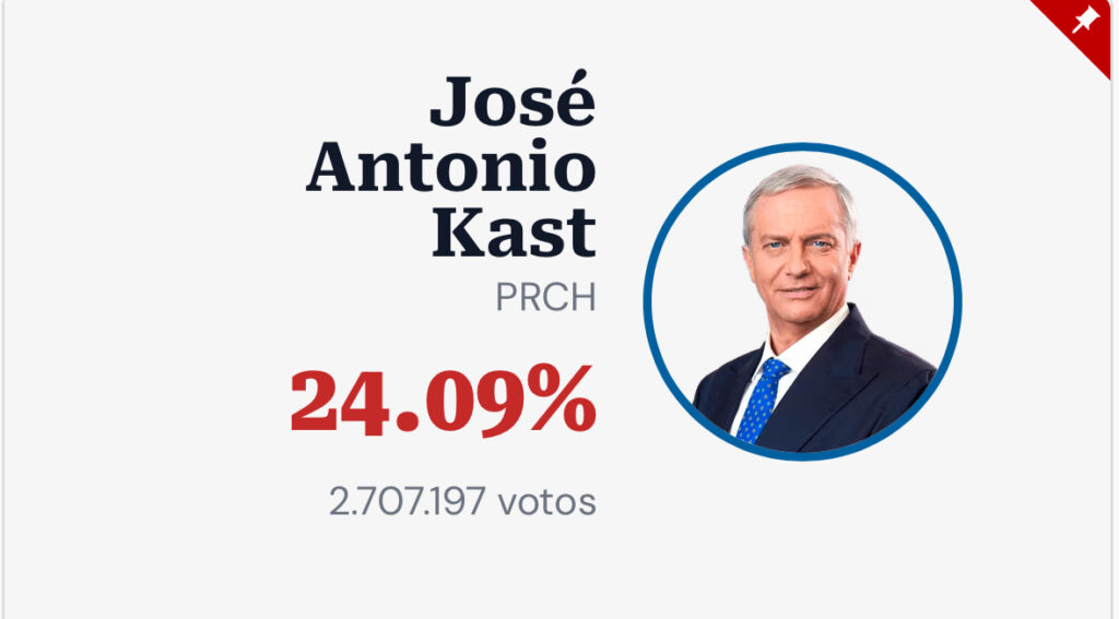 José Antonio Kast (partido de derecha / conservador) le sigue con cerca del 24,1 %.
