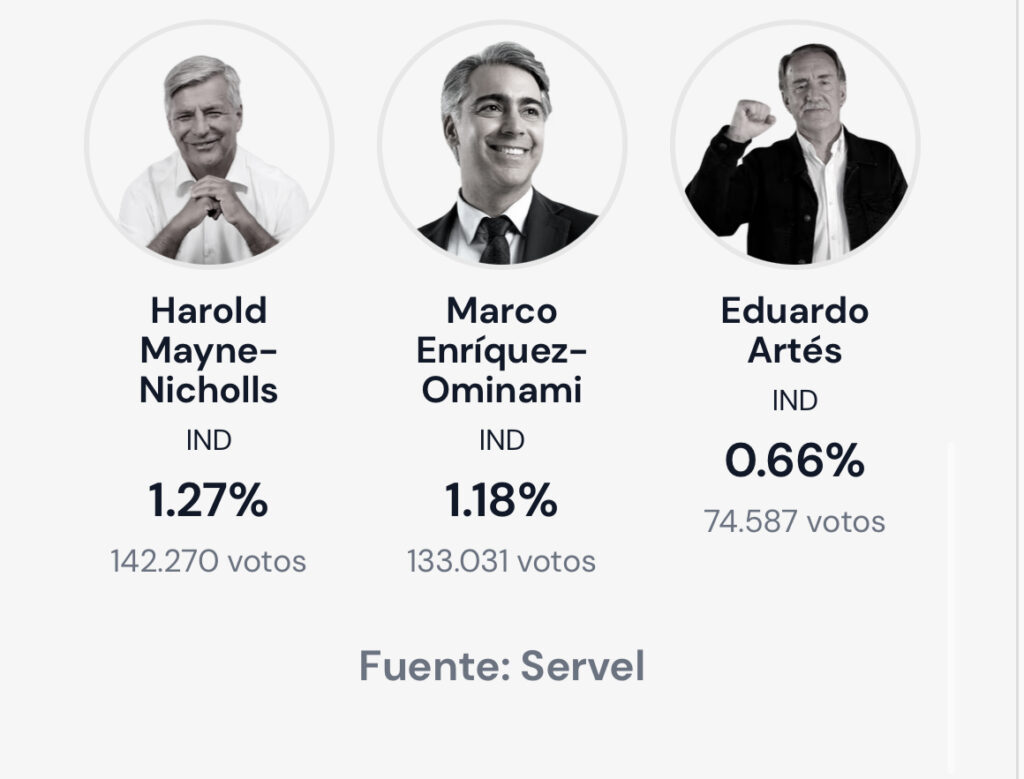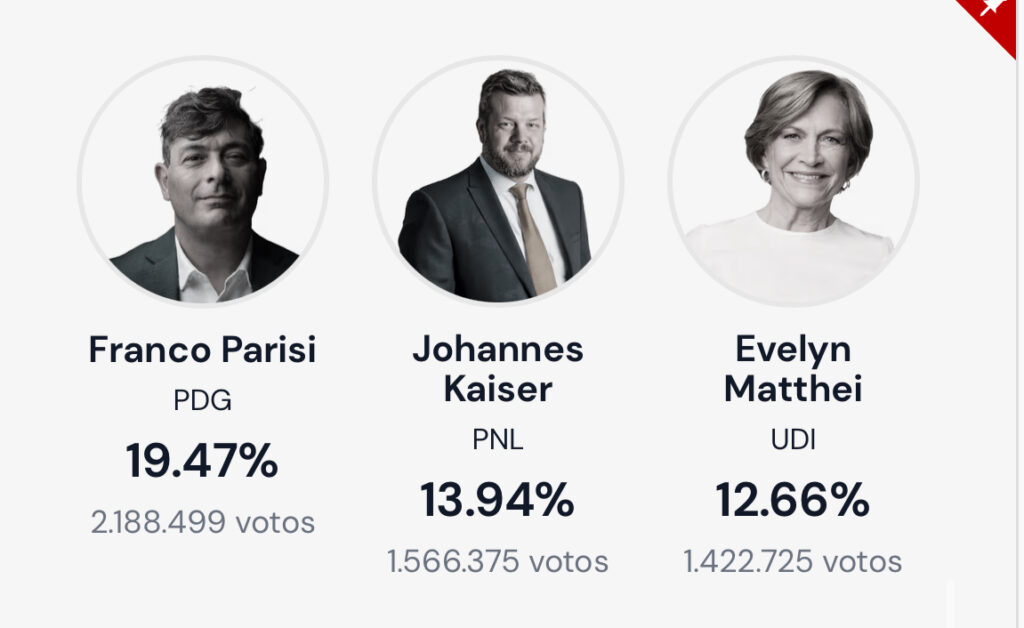Mientras que la gran sorpresa de la jornada, Franco Parisi (19,52%), logra consolidarse en el tercer lugar, seguido por una Evelyn Matthei (12,62%) que ahora ve peligrar su cuarto puesto por Johannes Kaiser (13,94%).
